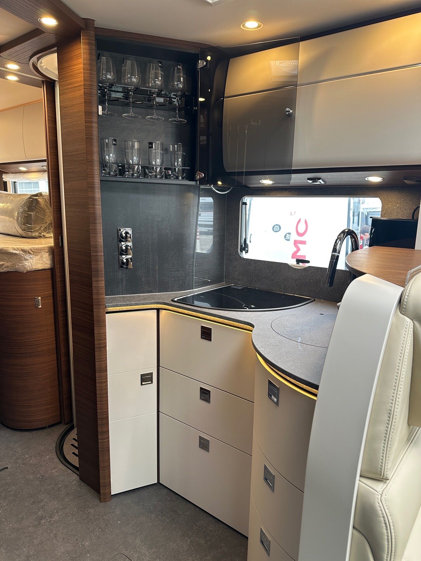 - Design-Barschrank mit Gläserhalter und Glas-Set über Küche