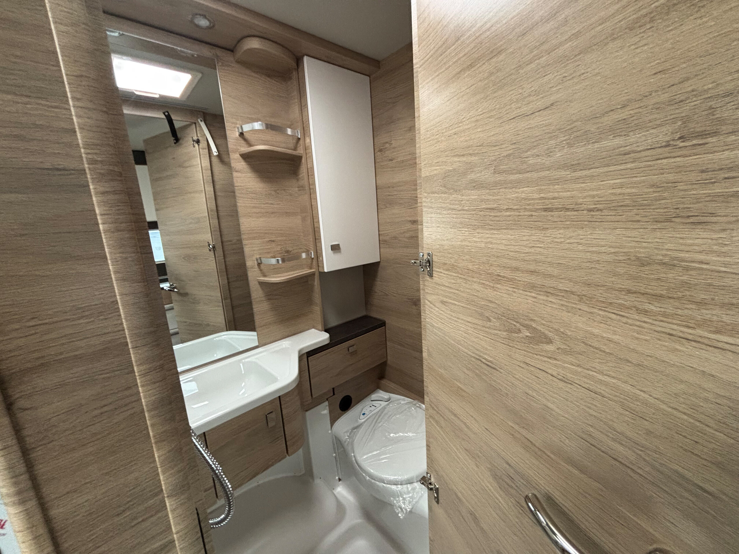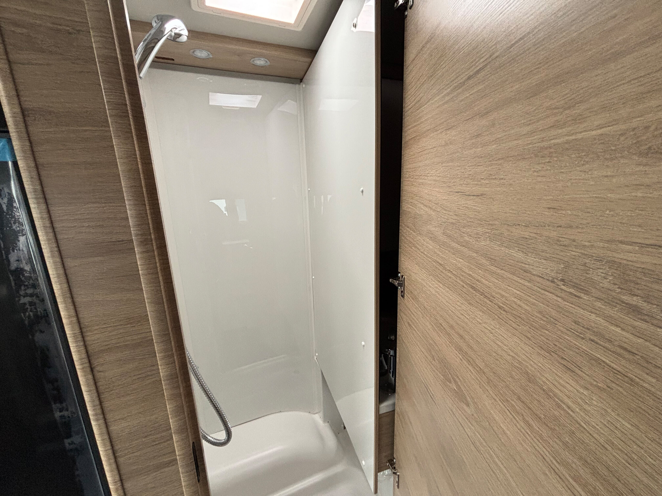• Komfortdusche für Mitteltoilettenraum (Schwenkbad mit Vorhang im Waschraum)