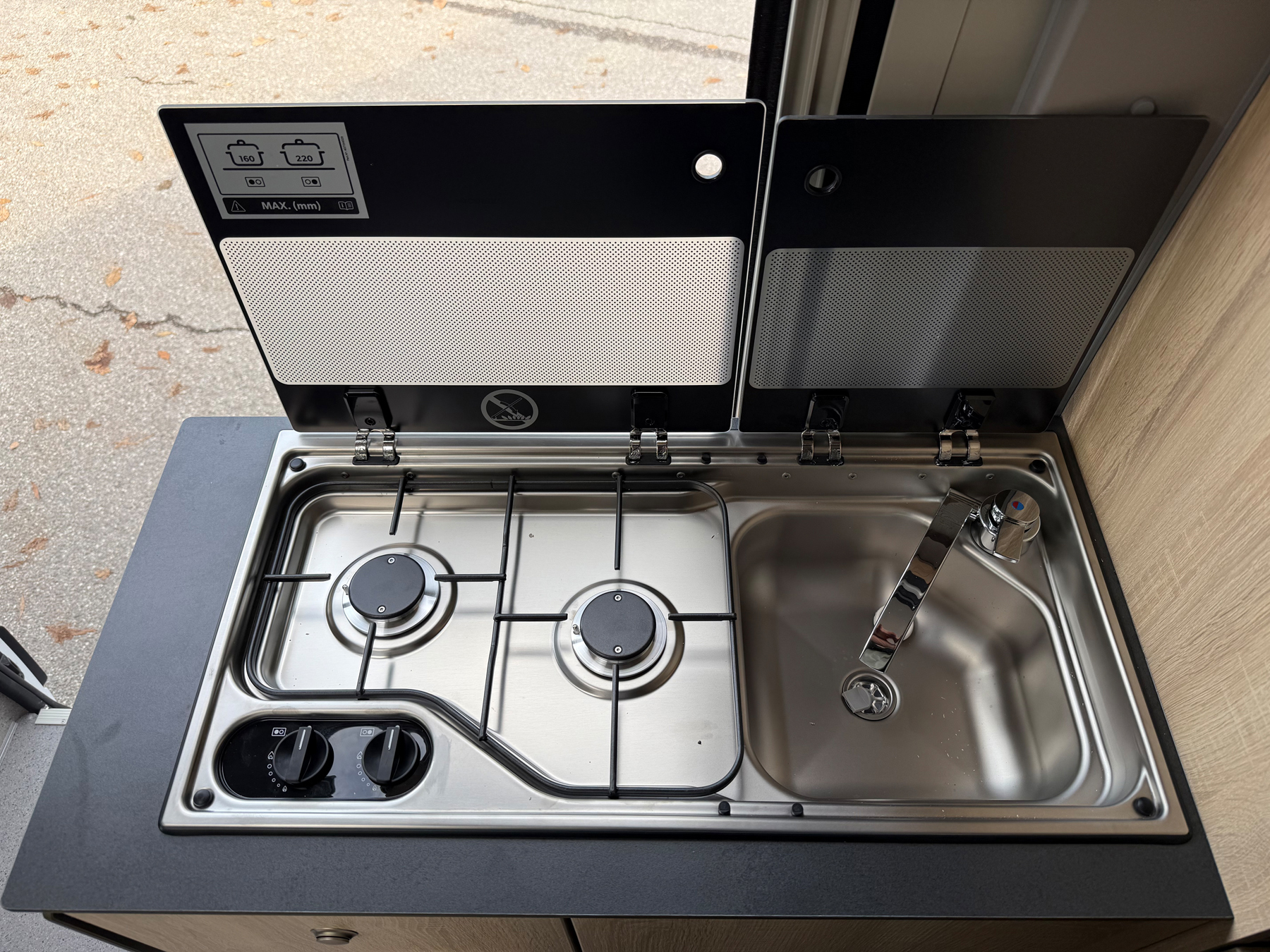 - Design-Paket innen (Klappendesign, Arbeitsplatte, Tisch dunkel)