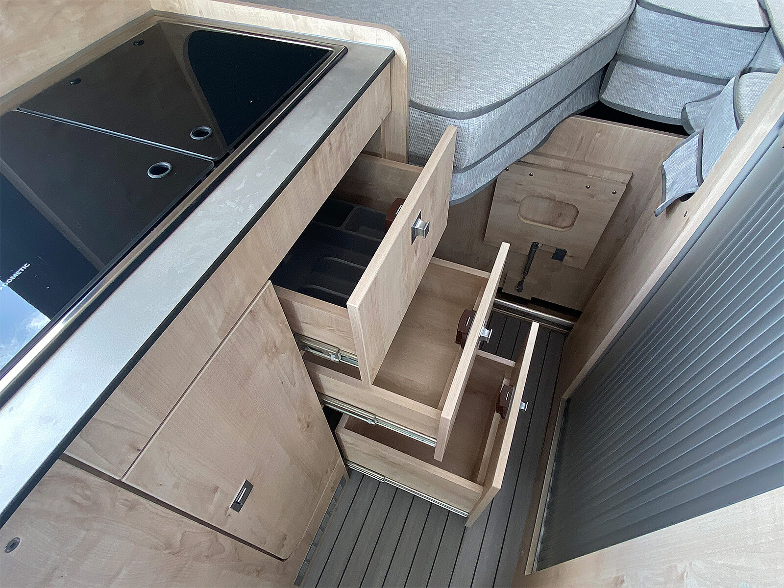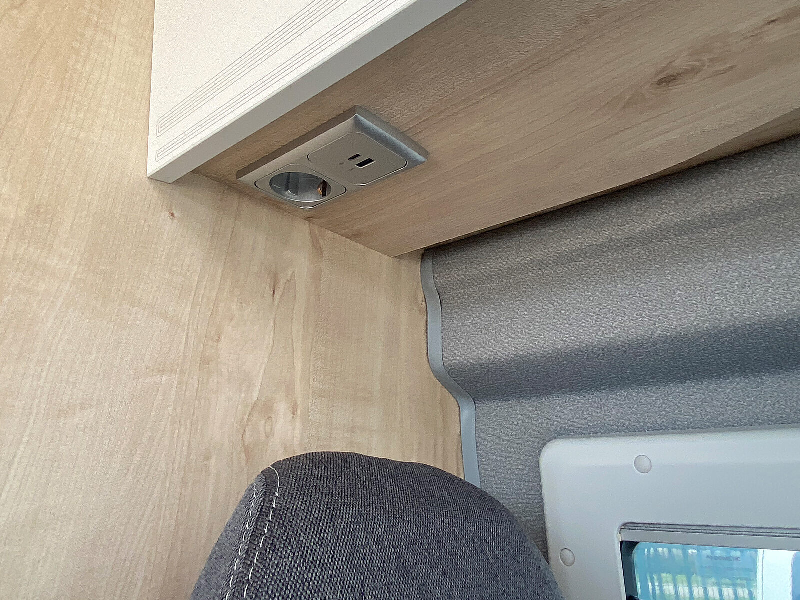 - 3er-Satz Steckdosen (USB, 12V, 220V) hinten über Bett links