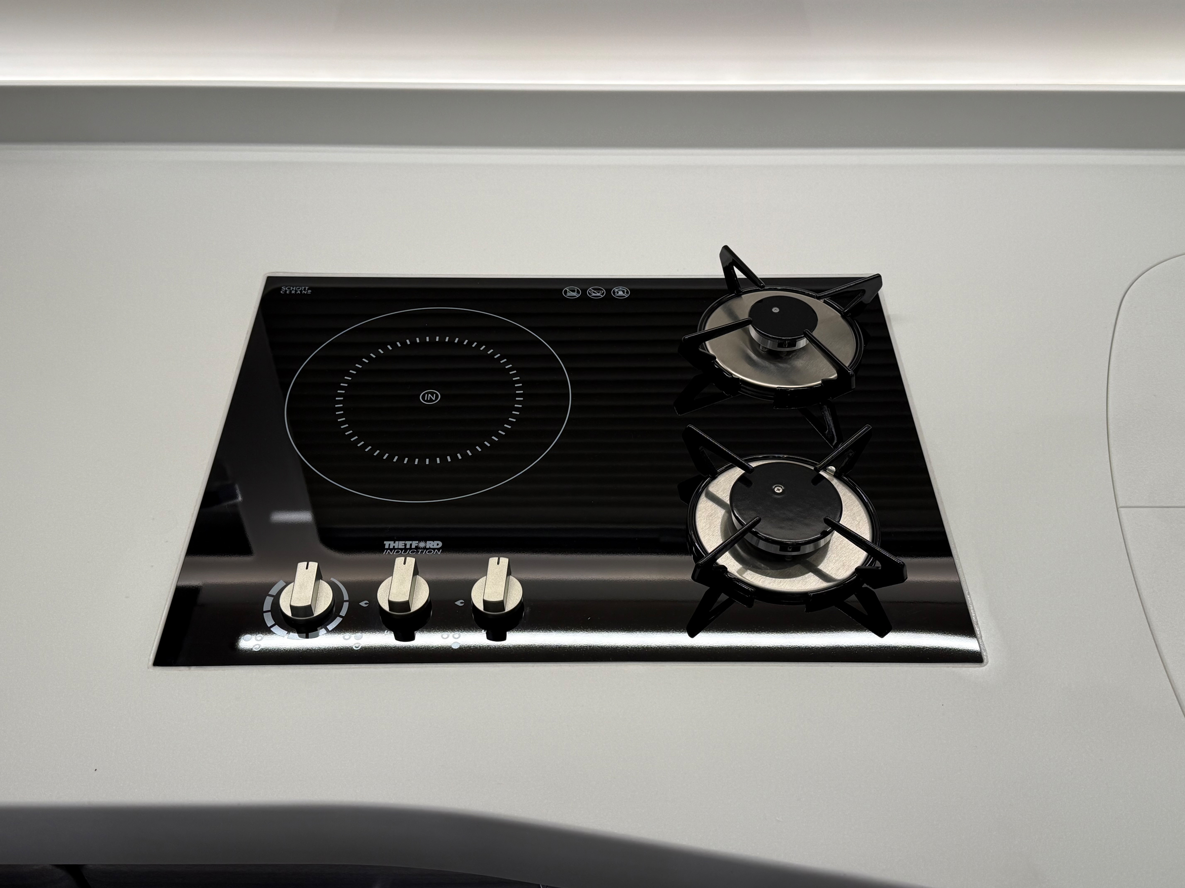 - Hybrid-Ceran-Kochfeld mit zwei Gas-Kochfeldern und einem Induktionskochfeld