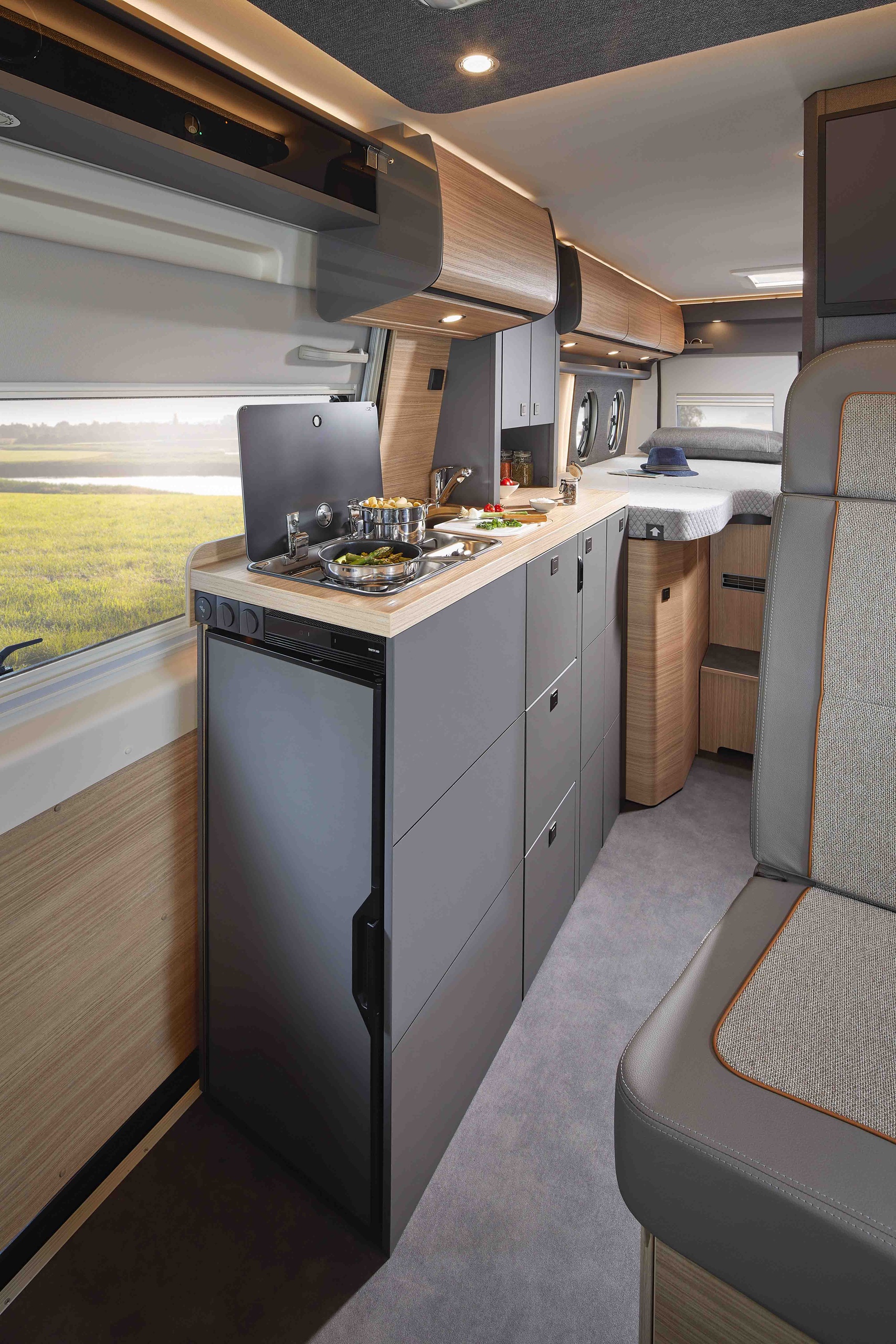 Pilotensitze in Wohnraumstoff bezogen inkl. gepolsterten Armlehnen