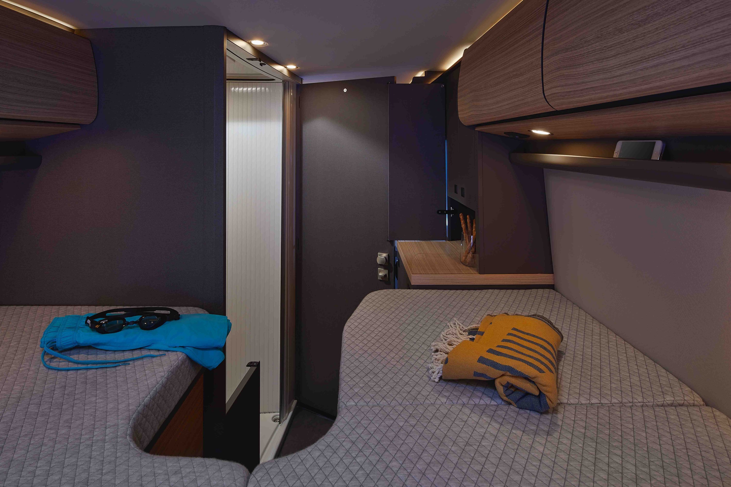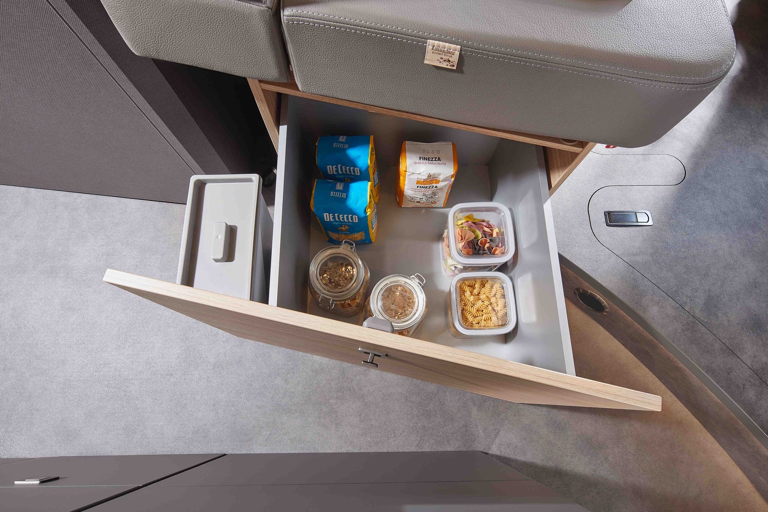 Pilotensitze in Wohnraumstoff bezogen inkl. gepolsterten Armlehnen