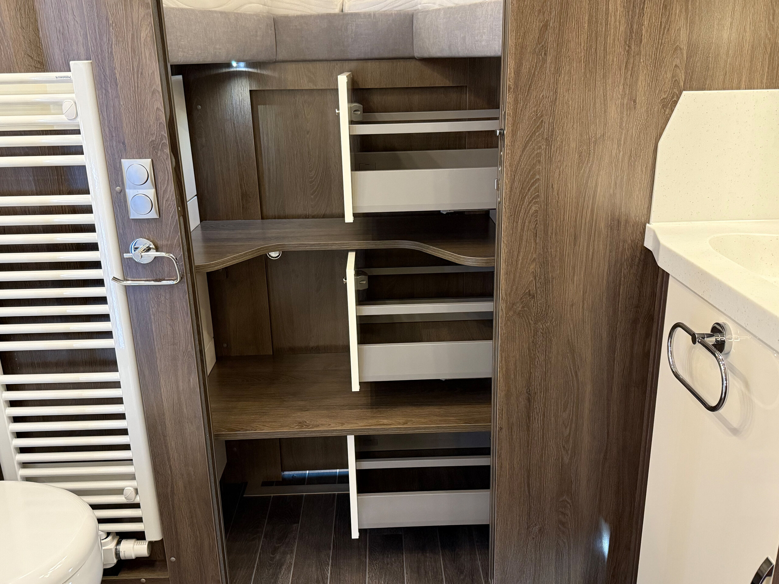 - Anstelle der Schränke links und rechts am Alkoven auf jeder Seite 3 Schubkästen